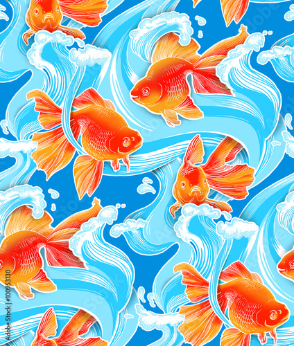 © doublebubble_rus, Naklejka premium Goldfish illustration artwork line underwater pattern seamless texture