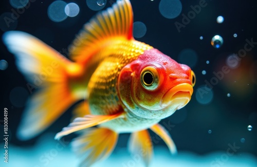 © starush, Fototapeta premium Goldfish swimming in clear water with bubbles and a soft blue background
