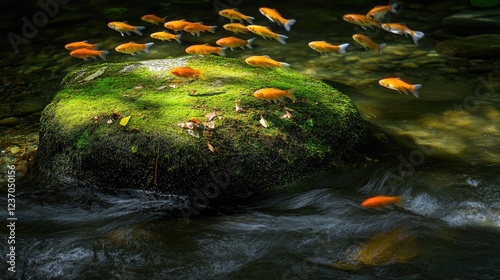 © Rere_Art151, Obraz premium Goldfish swimming near mossy rock in stream