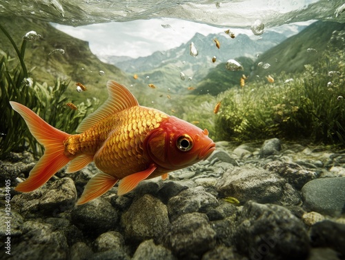 © Goncharenko, Naklejka premium Goldfish swimming near rocks and grass