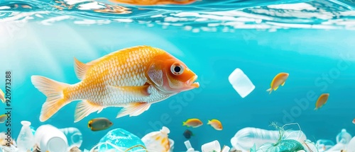 Naklejka premium Goldfish swimming surrounded by plastic waste in polluted water, highlighting...