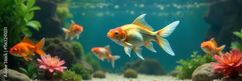 © patiphan, Fototapeta premium Goldfish wearing shark fin costume swimming in a bowl with colorful fish friends, aquatic animals, shark fin