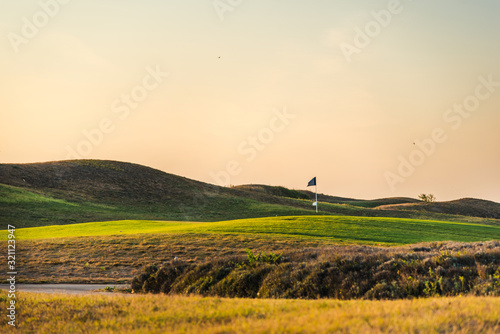 Fototapeta premium Golf club flag and green golf lawns at sunset.