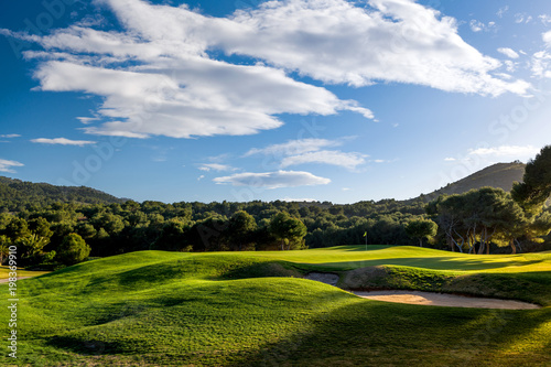 Obraz premium Golf course on sunset with green grass, blue sky and clouds. Photo taken in Spain at the La Manga Club.