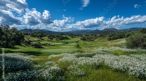 © Gilang, Obraz premium Golf course vistas with wildflower meadows and rolling hills under a blue sky
