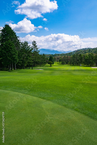 © okimo, Obraz premium Golf Course with beautiful green field. Golf course with a rich green turf beautiful scenery.