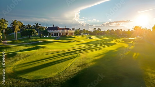 Obraz premium Golf course with colonial style clubhouse picture