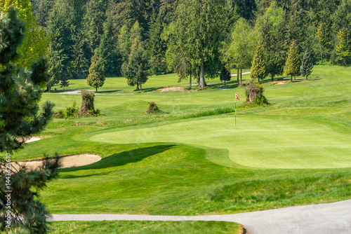 Obraz premium Golf course with gorgeous green and fantastic forest view in Vancouver, Canada, North America. Day time on April 2025.
