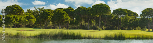 © nexusseven, Fototapeta premium Golf course with lake and trees in belek Turkey