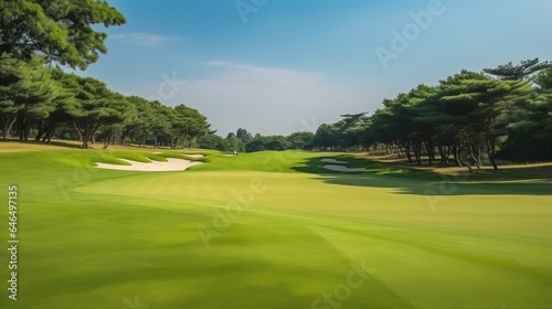 Obraz premium Golf green with fresh green grass field and bunkers in afternoon sunlight.