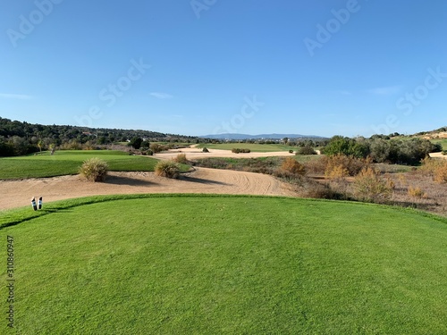 © Lewis, Obraz premium golf tee boxes with sand and clear blue sky