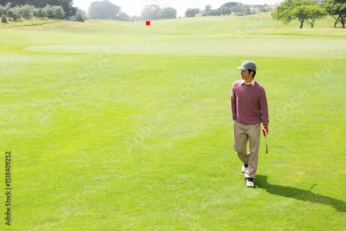 Fototapeta premium Golfer walking across vibrant green fairway toward red flag, holding putter with red glove