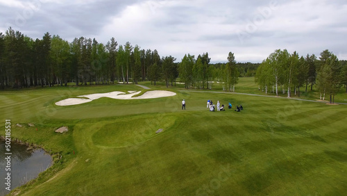 Obraz premium Golfers hitting golf shot with club on course while on summer vacation, aerial
