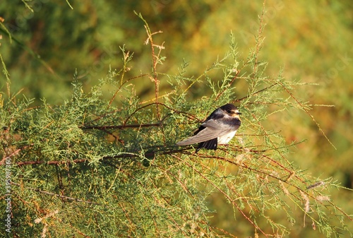 Obraz premium golondrinas en la rama de un pino, plumas color gris, blanco, negro y naranja, ojos y pico muy pequeños, migratoria, lerida, españa, europa