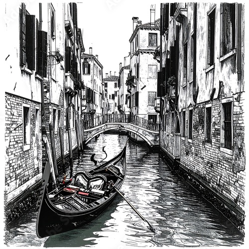 © Bihi, Fototapeta premium Gondola in a narrow, black and white Venetian canal, under a stone bridge