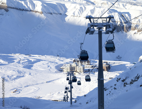 Obraz premium Gondola lift on ski resort at winter sun evening