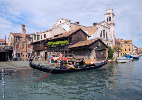 Obraz premium Gondola with tourist near Gondolas Repair Yard in Venice.