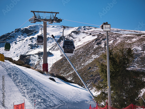 Obraz premium Gondolas that go to the top of the ski resort so that skiers and snowboarders...