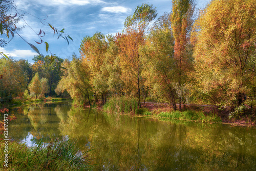 © Mykhailo, Fototapeta premium good autumn day on the shore. autumn colors. landscape.