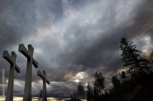© David Gn, Obraz premium Good Friday Easter Day Crosses Clouds Trees Background