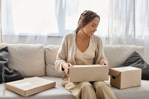 Naklejka premium good looking jolly african american woman sitting on sofa and preparing to open cardboard box