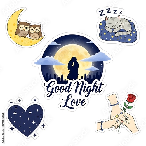 © Rahat, Fototapeta premium Good night love sticker collection with romantic elements