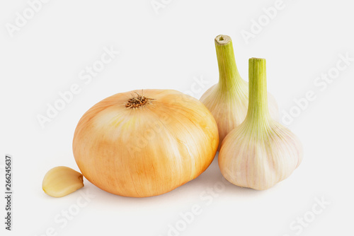 Fototapeta premium Good quality onion bulb and two heads with garlic clove on white background
