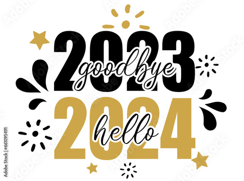 Fototapeta premium Goodbye 2023 Hello 2024 vector illustration. Happy New Year design isolated good for greetings cards, poster, print, sticker, invitations, baby t-shirt, mug, gifts.