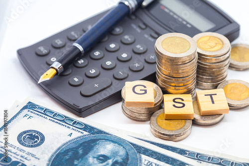 © amnarj2006, Fototapeta premium Goods and Services Tax word on stack coins isolate .