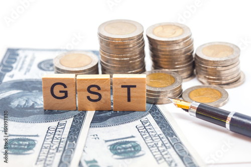 Fototapeta premium Goods and Services Tax word on stack coins isolate .