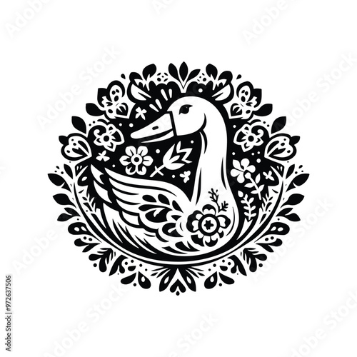 © Cici, Obraz premium Goose bird in folk art black and white silhouette illustration