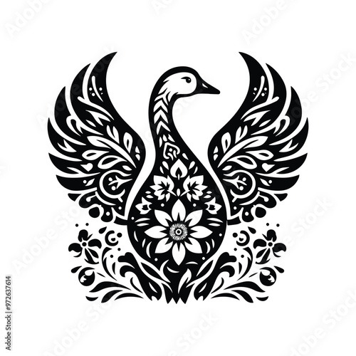© Cici, Obraz premium Goose bird in folk art black and white silhouette illustration