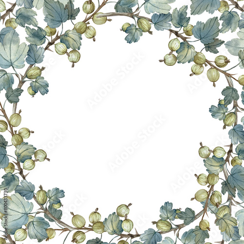 Fototapeta premium Gooseberry branches and berries square frame hand painted with watercolors.