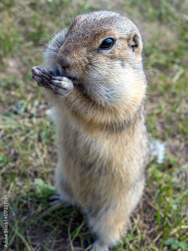 © vadim, Naklejka premium Gopher is standing on its hind legs on the grassy field and eating sunflower seeds