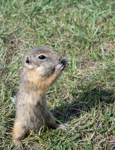 © vadim, Fototapeta premium Gopher is standing on its hind legs on the grassy field and eating sunflower seeds
