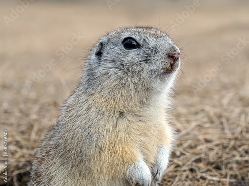 Fototapeta premium Gopher on a lawn is looking at the camera. Waking up rodent after season hibernation. Close-up portrait of a rodent.