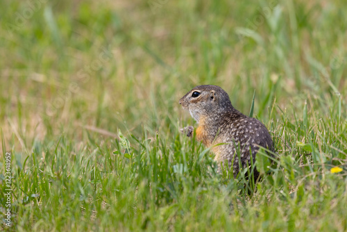 © Shchipkova Elena, Fototapeta premium Gopher stands in the grass on a summer day