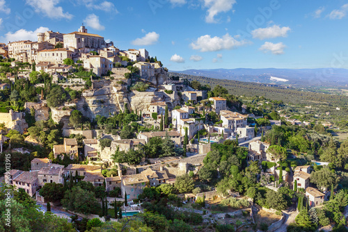 © Pvince73, Fototapeta premium GORDES, PROVENCE, FRANCE: aerial view of traditional hilltop village, one of the most beautiful villages of France, "Les Plus Beaux Villages de France" label, Luberon, Vaucluse