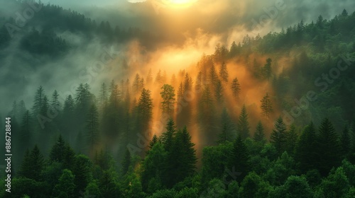© QuietWord, Naklejka premium gorgeous aerial view of conifer forest with fog drifting around at morning time with sunrise light, sunlit over cloud