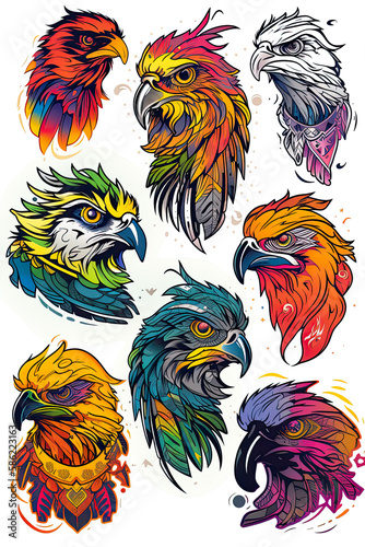 © Robbot17, Fototapeta premium Gorgeous birds sticker design, owl, eagle, flying apex predators. Generative ai