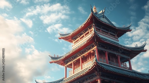 © Depal, Fototapeta premium Gorgeous Chinese pagoda with green roof and traditional architectural elements image