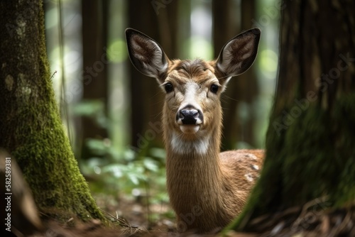 © AkuAku, Fototapeta premium Gorgeous deer with large horns a young deer alone. Generative AI