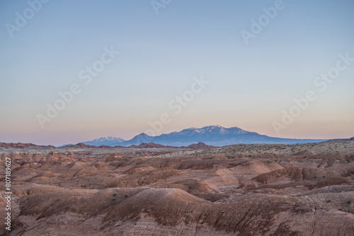 Fototapeta premium Gorgeous Desert Hills in Goblin Valley Utah Snow Capped Mountains Sunset