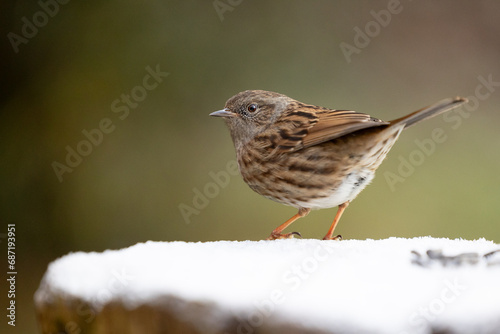 Fototapeta premium Gorgeous Dunnock ( prunella modularis) on a snowy log in December. Yorkshire,...