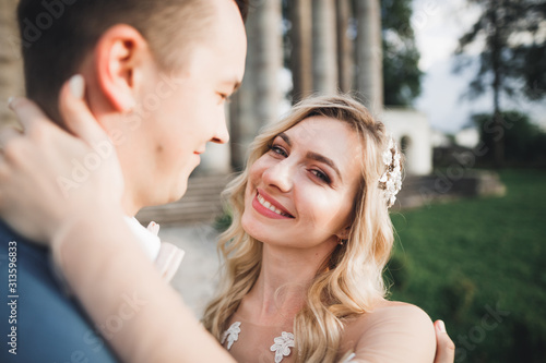 © olegparylyak, Fototapeta premium Gorgeous happy couple standing close to each other and looking in eyes