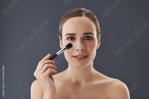Obraz premium Gorgeous lady holding makeup brush near face and looking at camera