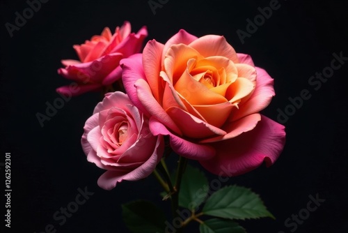 © Theerawat, Obraz premium Gorgeous multicolored rose cluster, rich black contrast, red, flowers, elegant