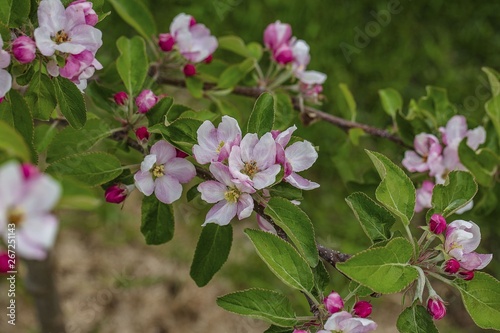 Obraz premium Gorgeous pink and white blooming apple tree on green background. Beautiful...
