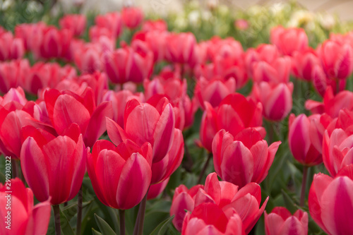 Fototapeta premium Gorgeous pink tulip field illuminated by the sun.