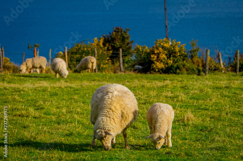 © Fotos 593, Fototapeta premium Gorgeous sheeps eating the grassland in Chiloe, Chile